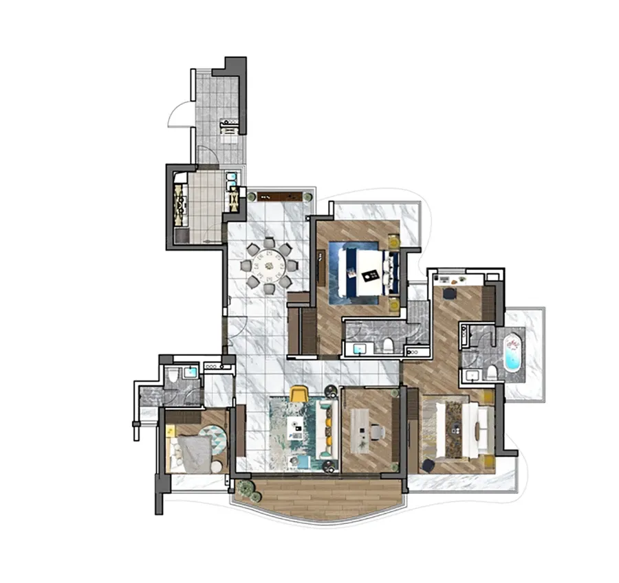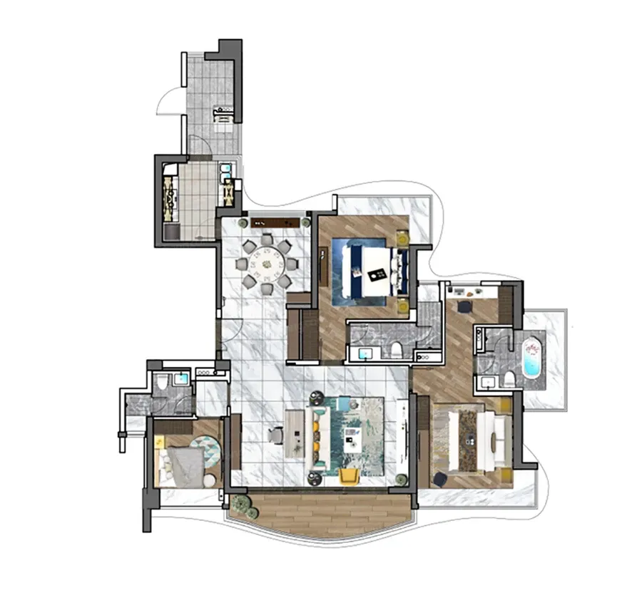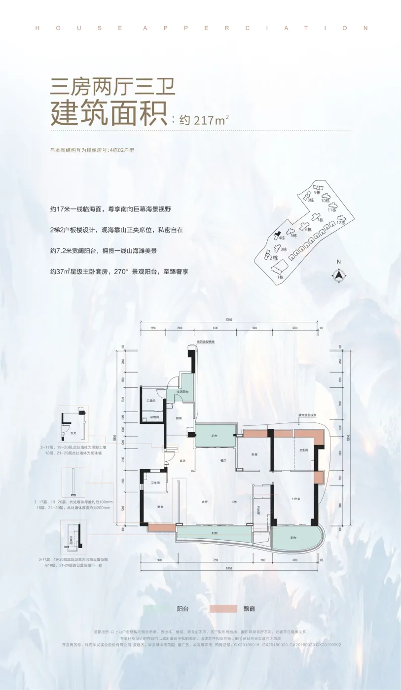 华发绿洋湾北倚凤凰山麓,三面山林环抱,面向浩瀚的南中国海,建筑分布以大围合方式向海敞开怀抱,南偏东约40°散点折板式布局,优化通风、采光与景观效果,重塑另一重山海人居境界。